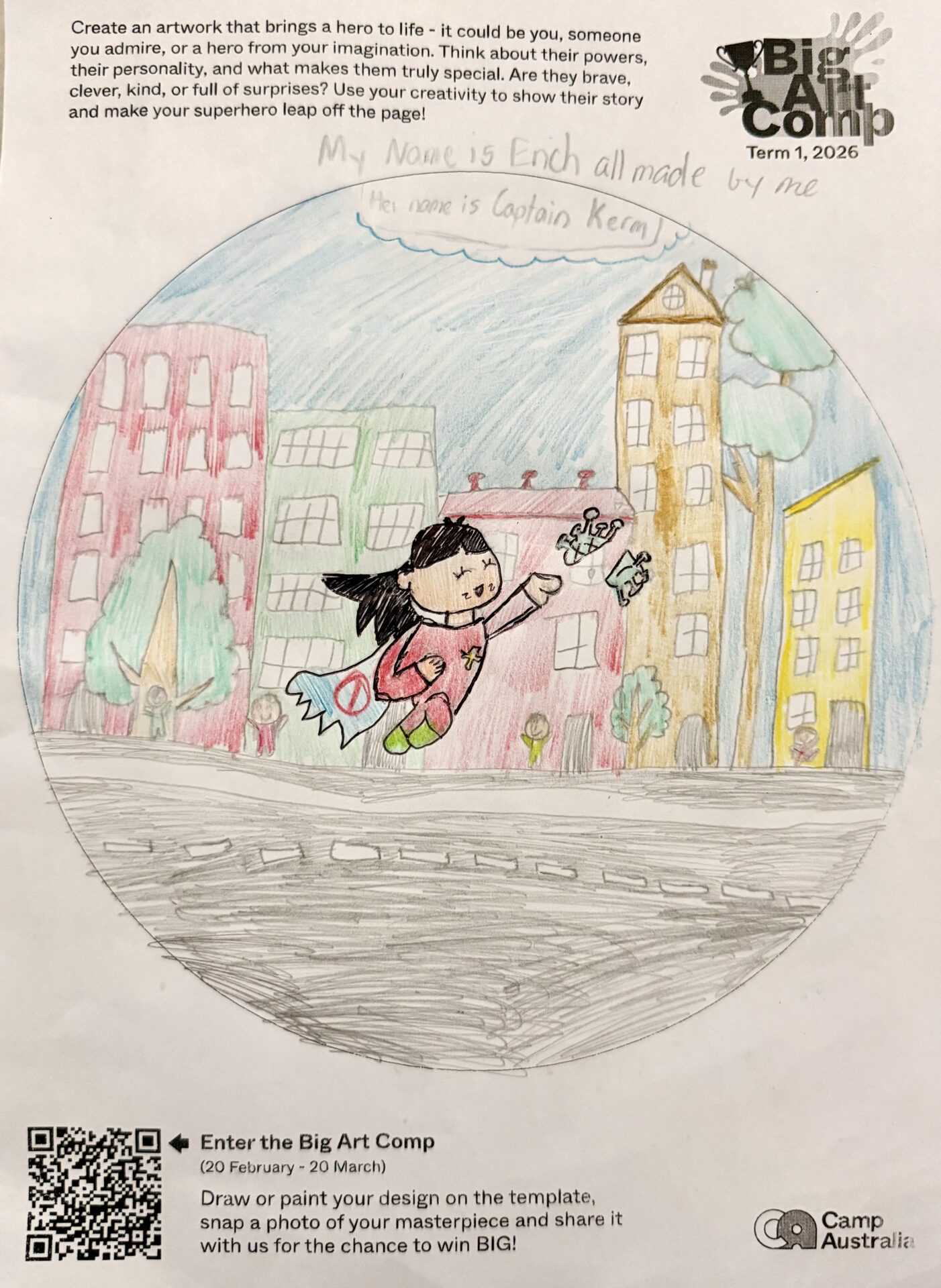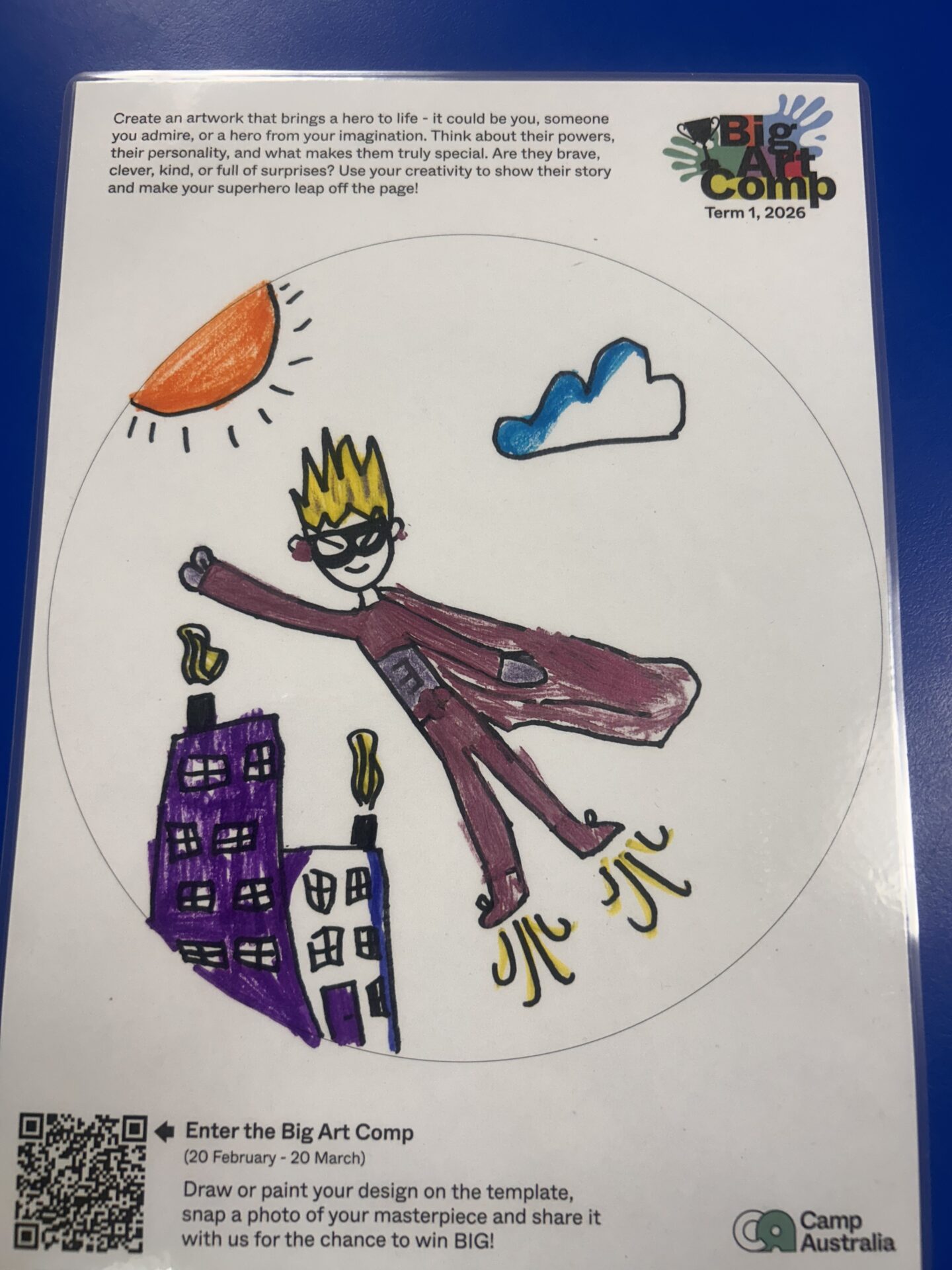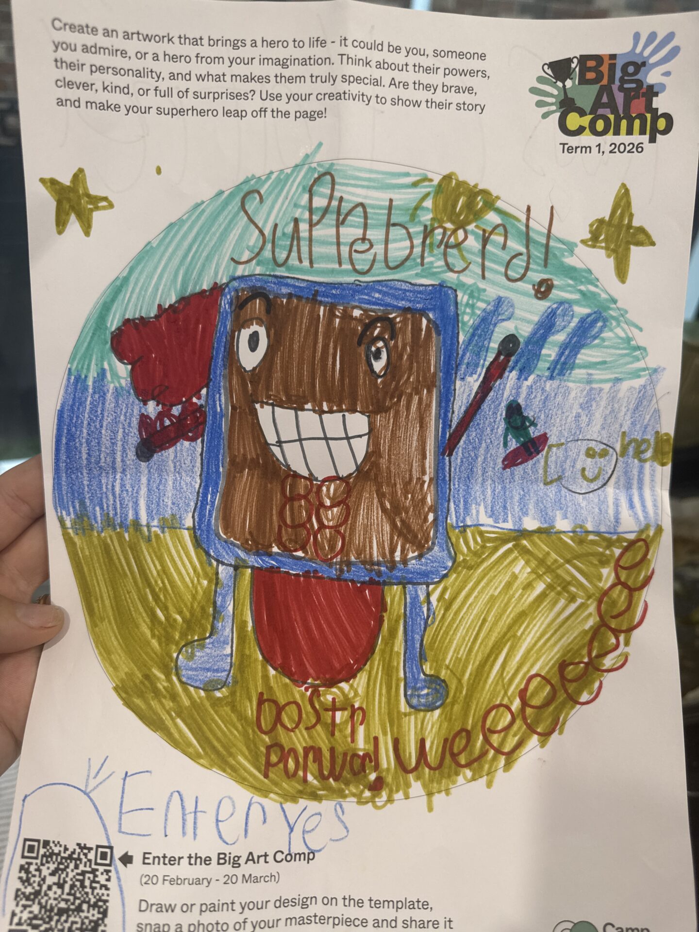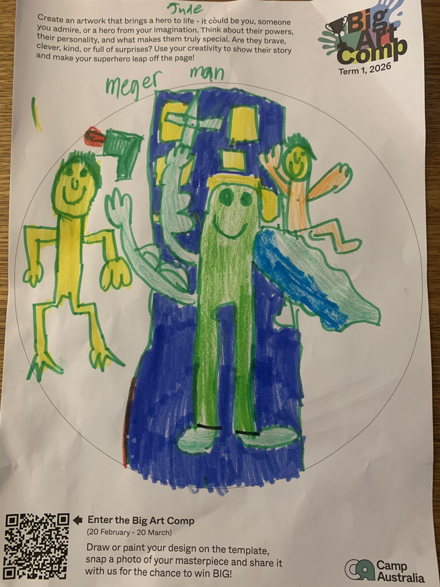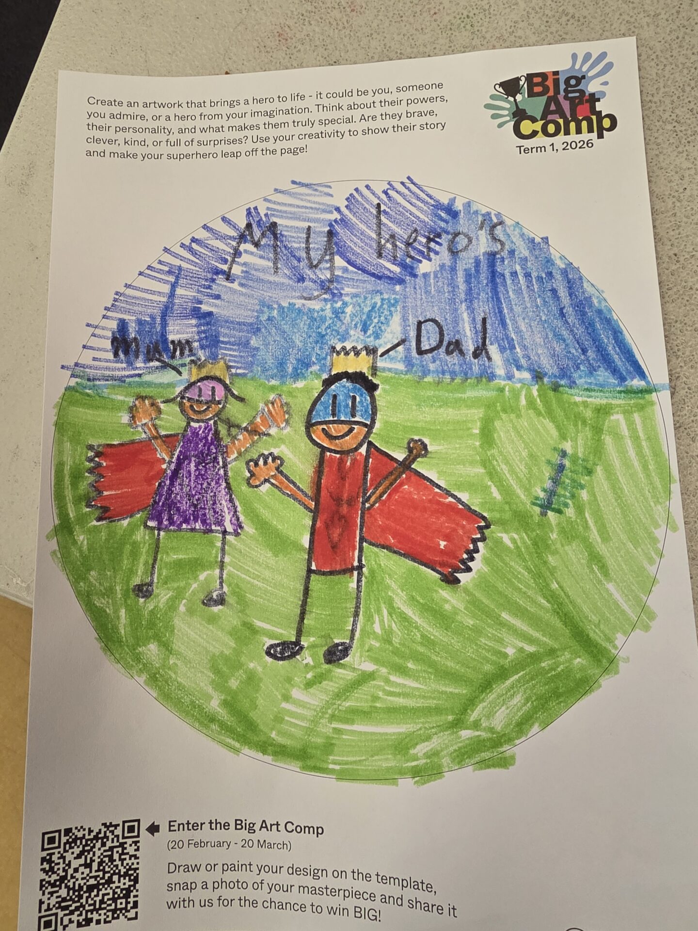 A huge thank you to all the incredible young artists who took part in our Term 1 Big Art Comp. Your superhero creations were full of imagination, energy and bold ideas – and we loved seeing what being a hero means to you.