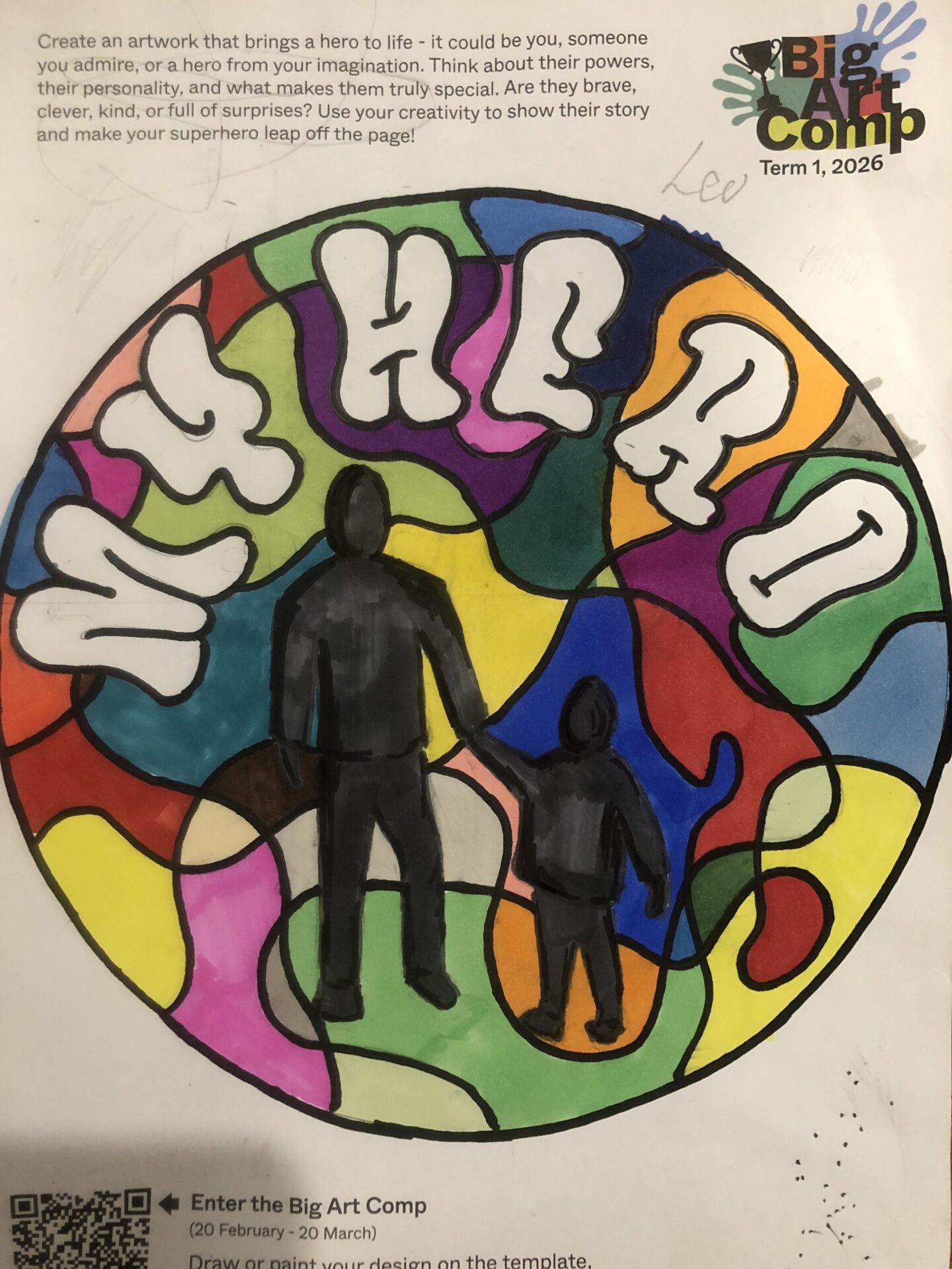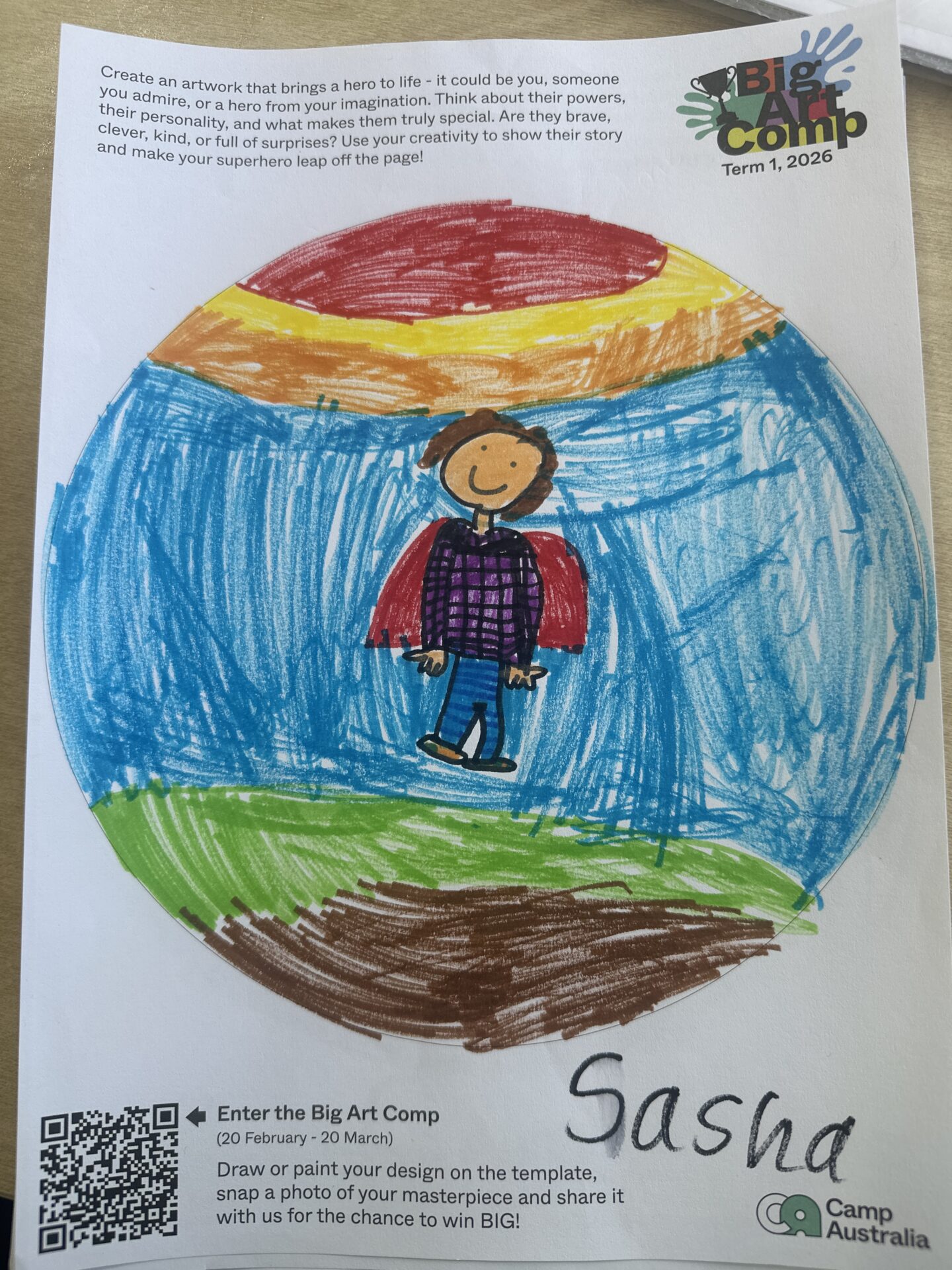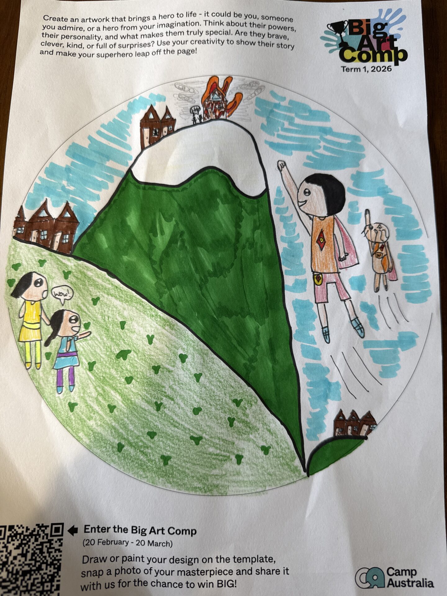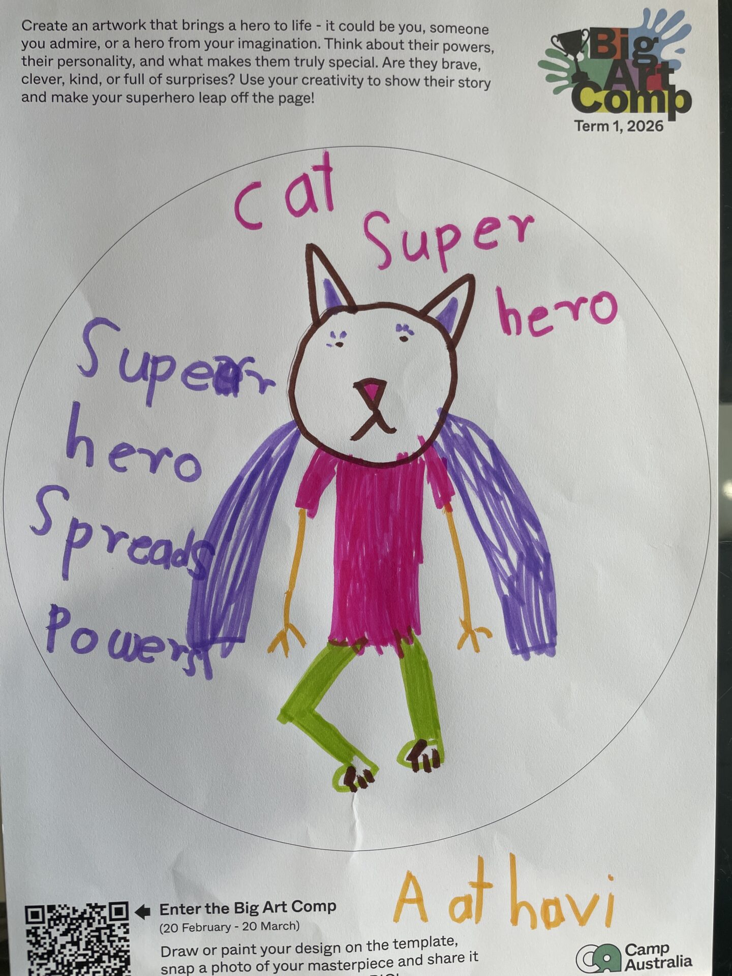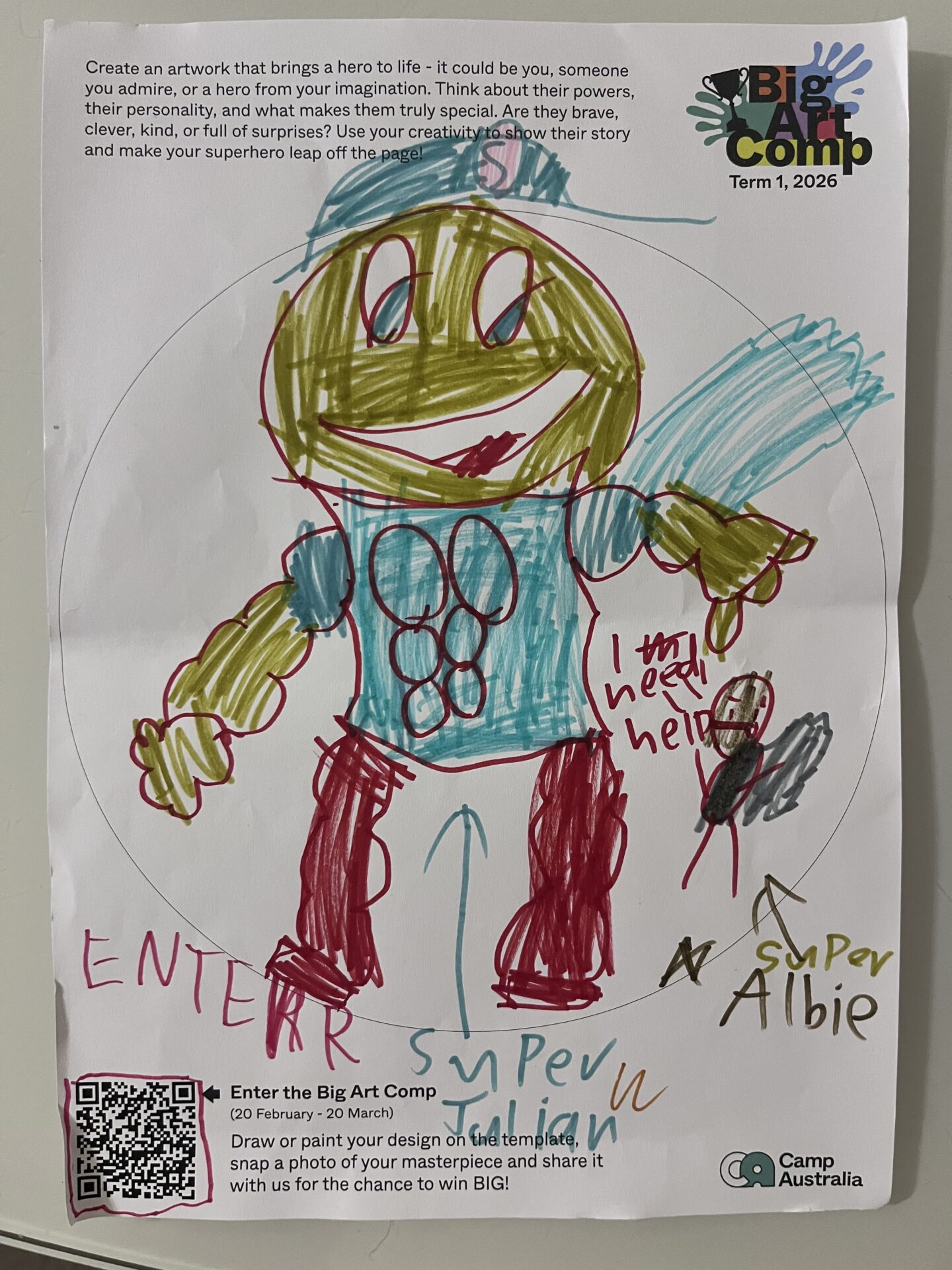 A huge thank you to all the incredible young artists who took part in our Term 1 Big Art Comp. Your superhero creations were full of imagination, energy and bold ideas – and we loved seeing what being a hero means to you.