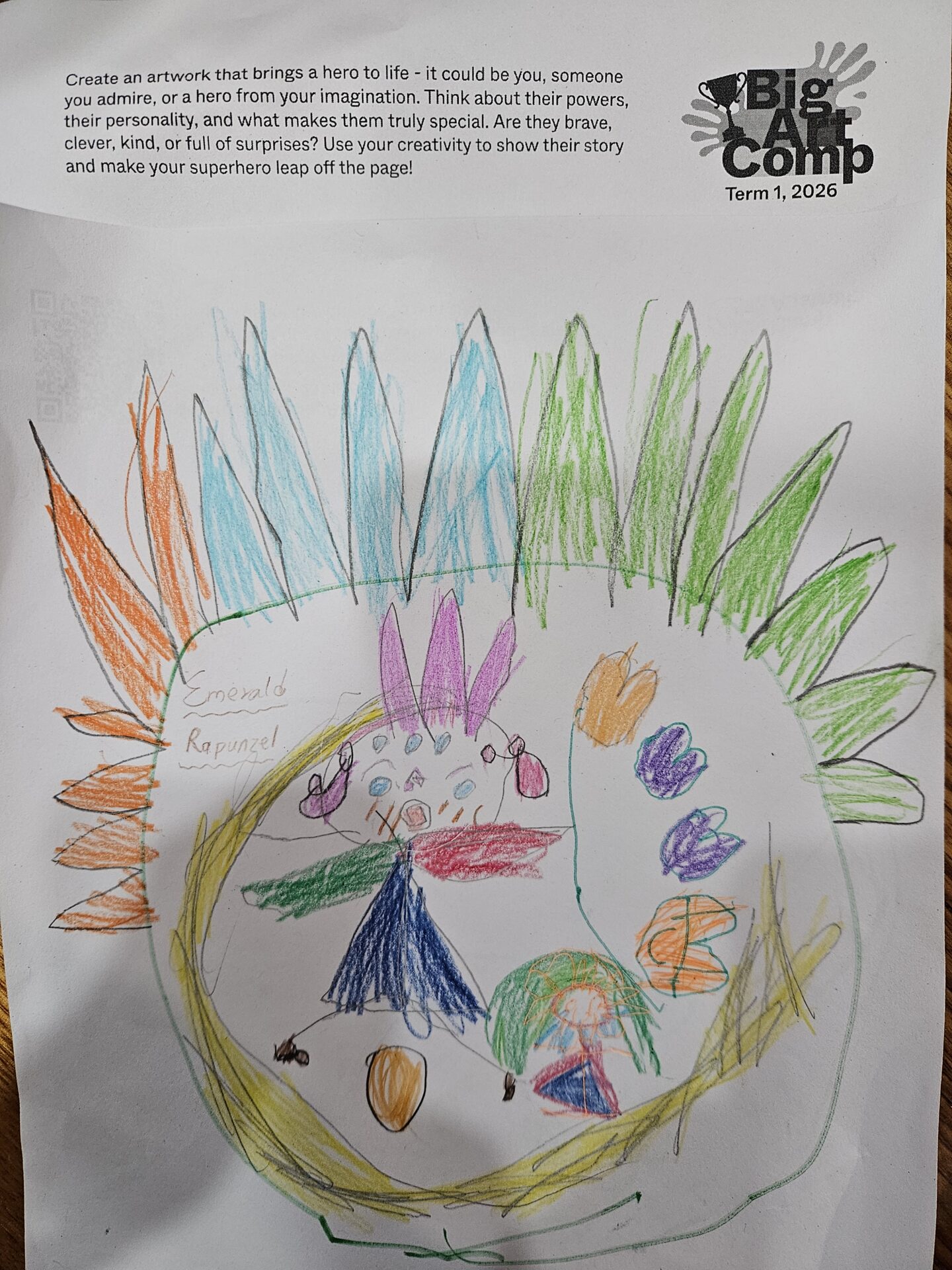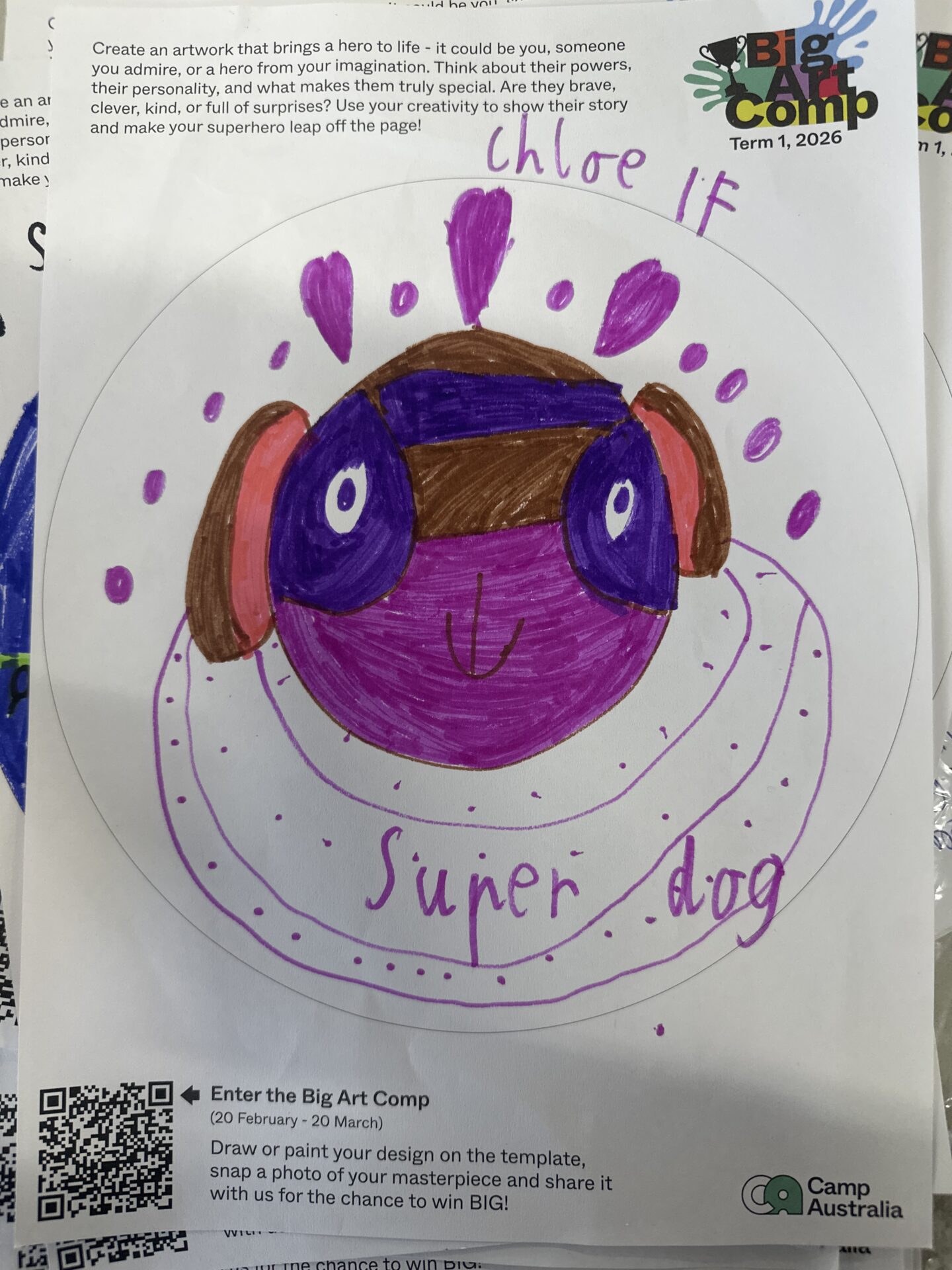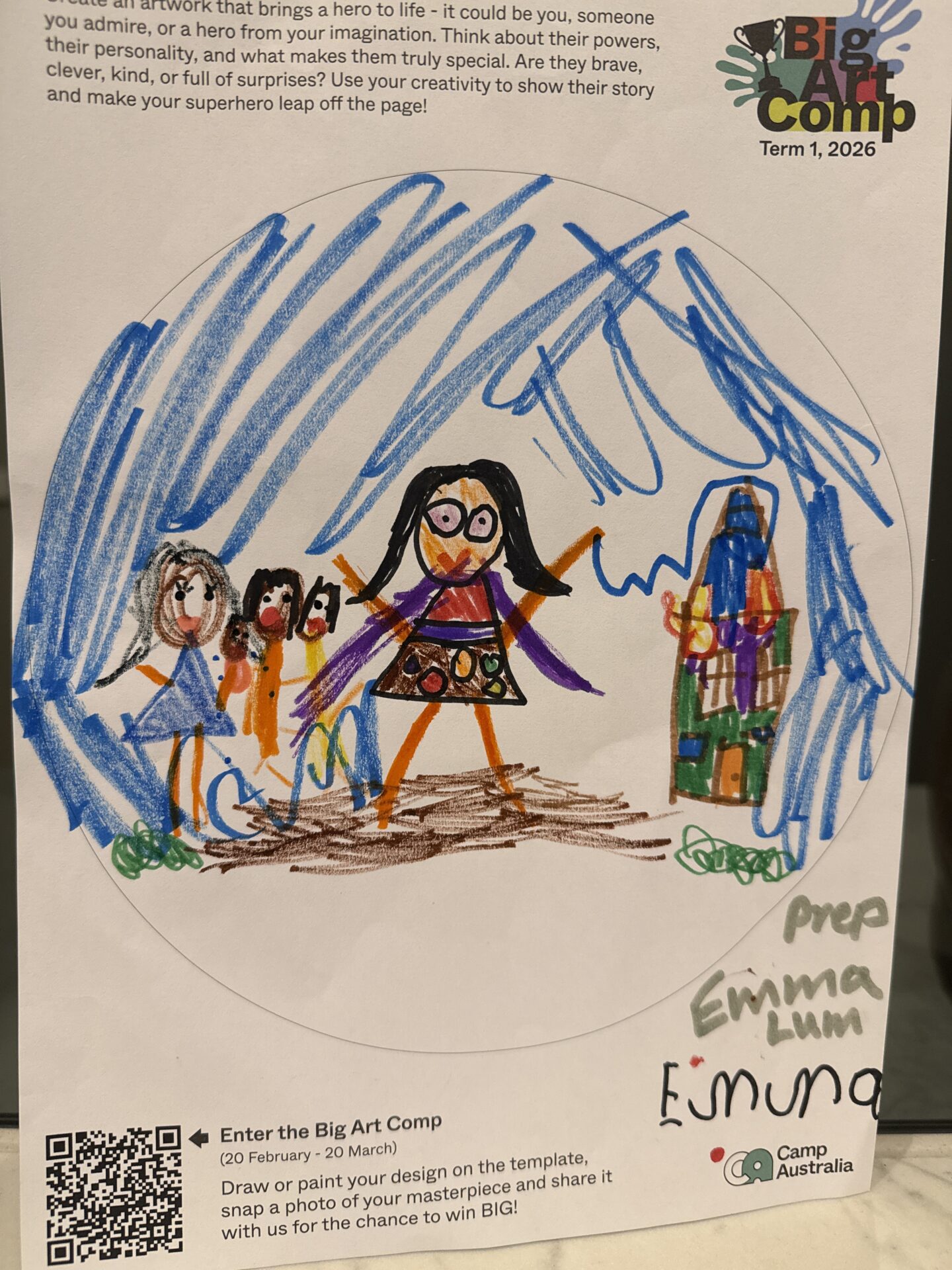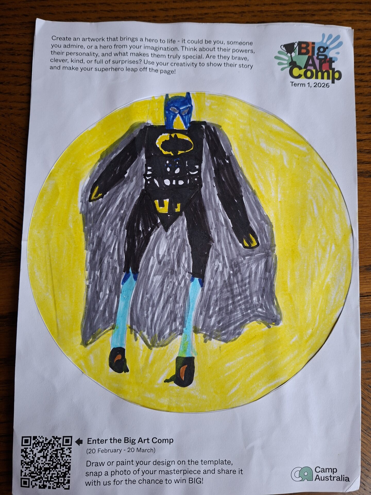 A huge thank you to all the incredible young artists who took part in our Term 1 Big Art Comp. Your superhero creations were full of imagination, energy and bold ideas – and we loved seeing what being a hero means to you.