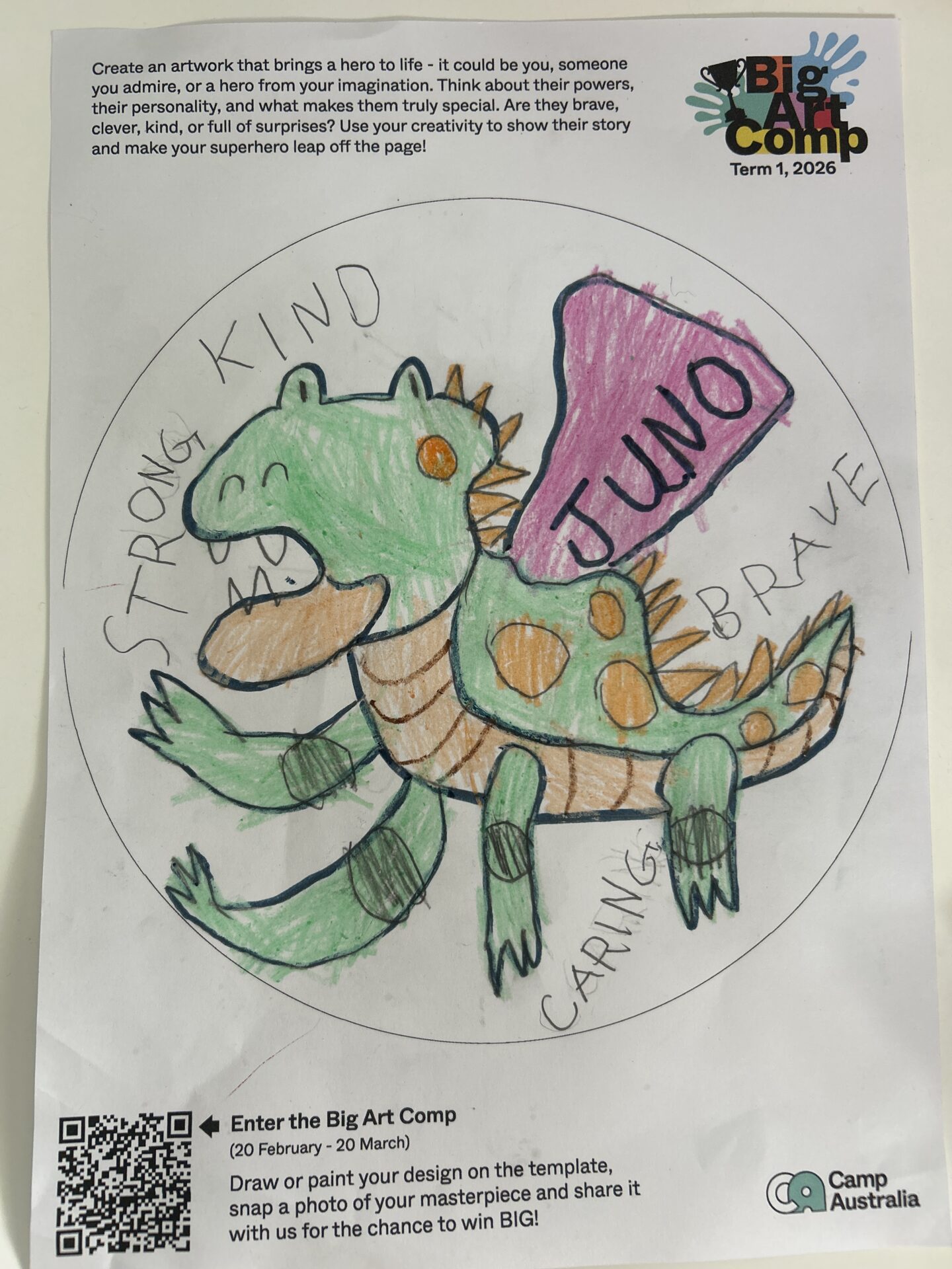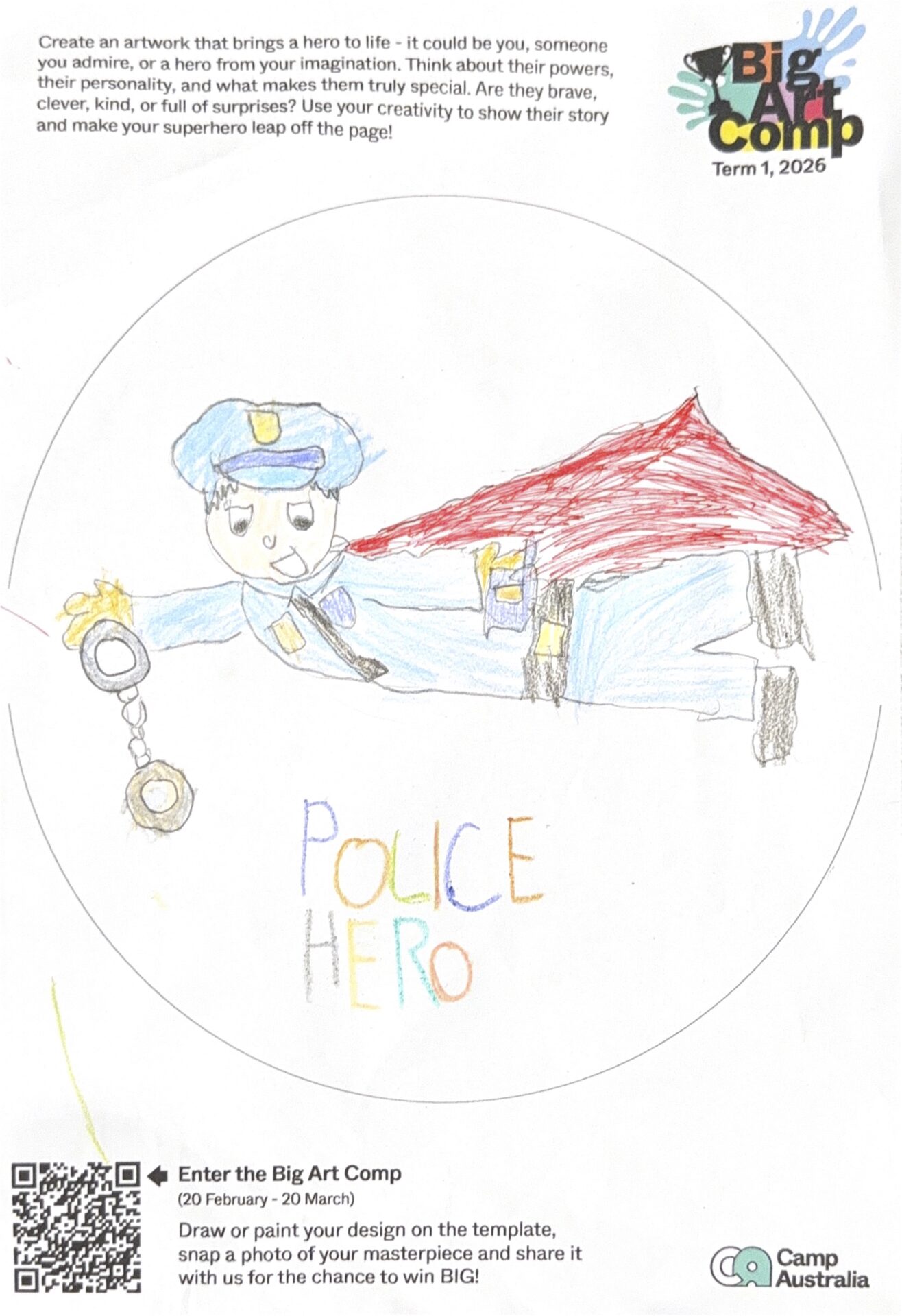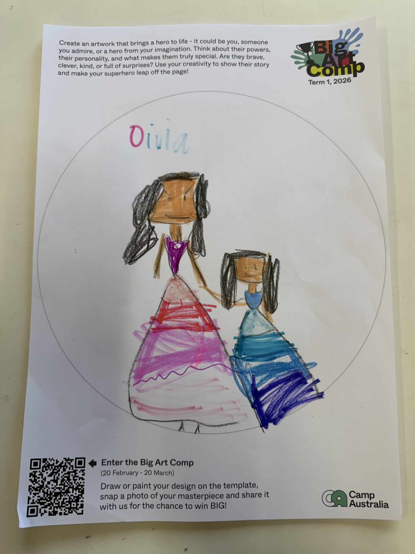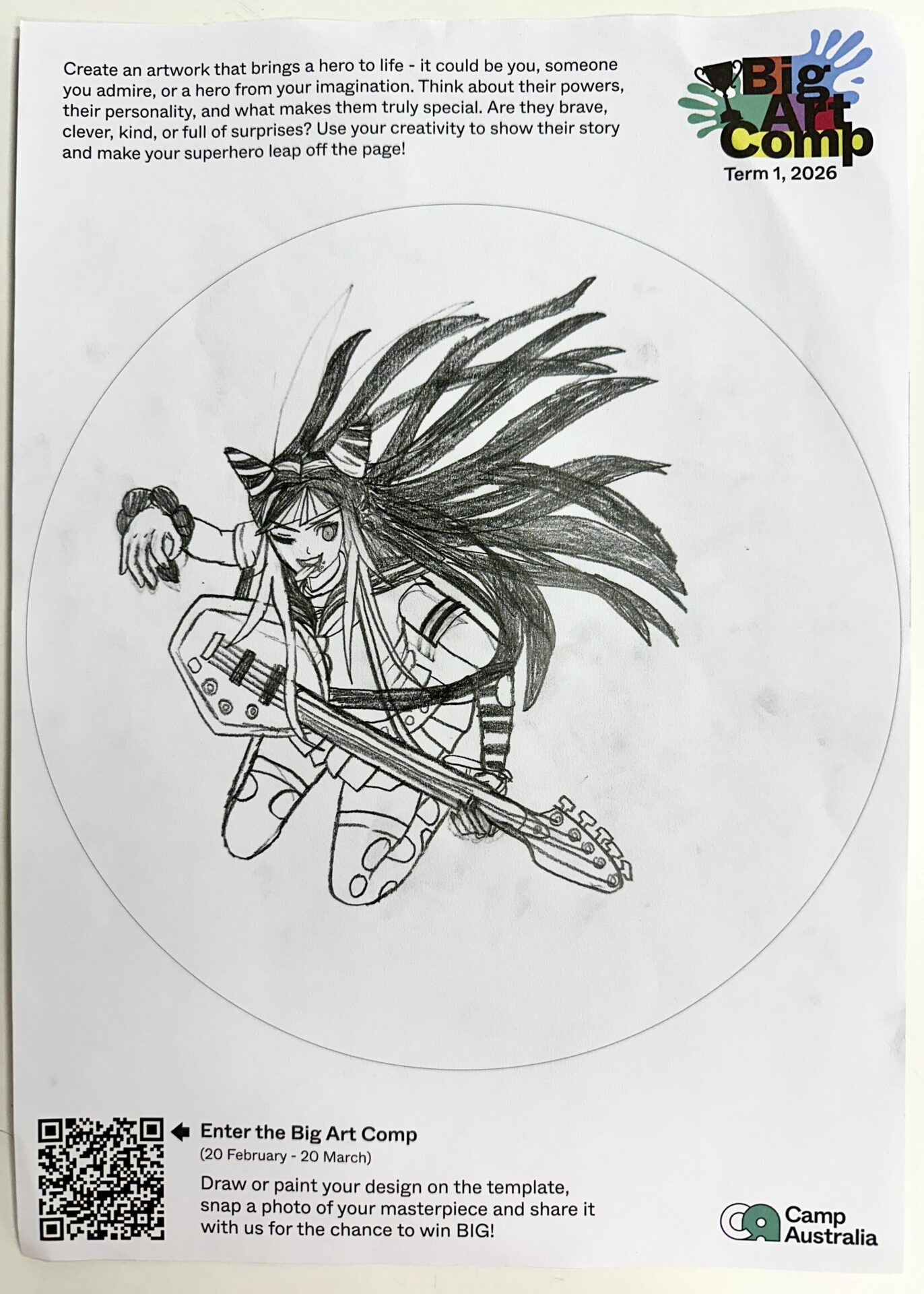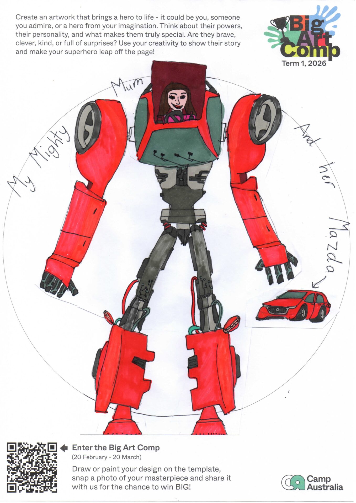 A huge thank you to all the incredible young artists who took part in our Term 1 Big Art Comp. Your superhero creations were full of imagination, energy and bold ideas – and we loved seeing what being a hero means to you.