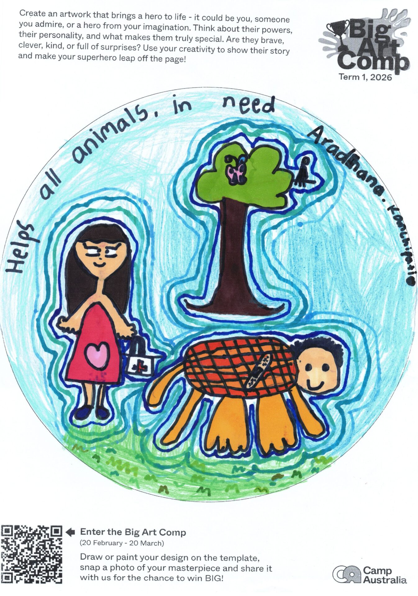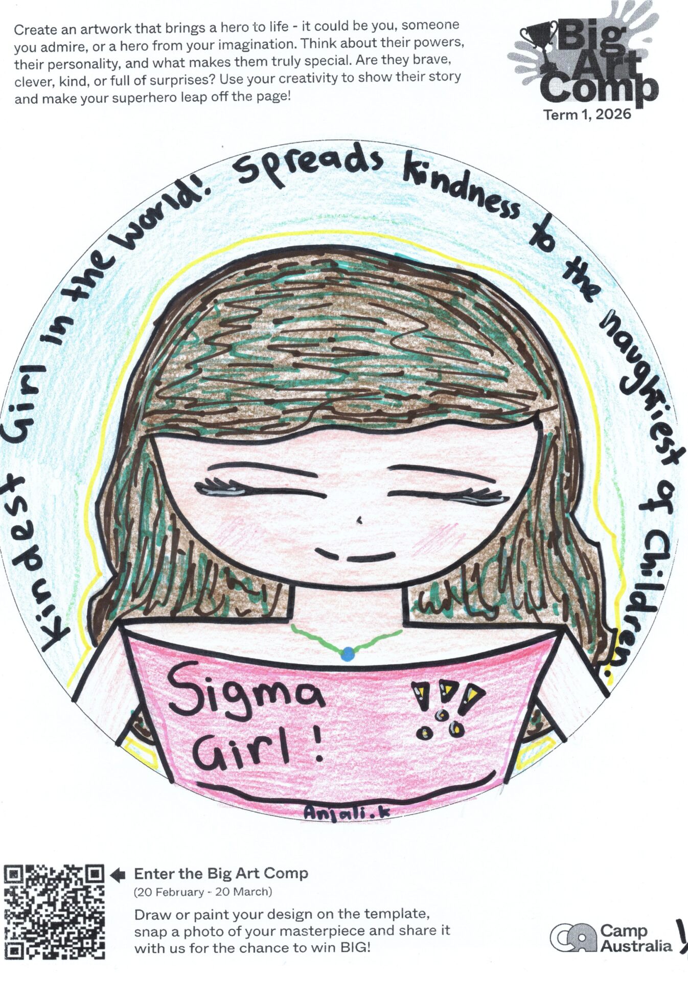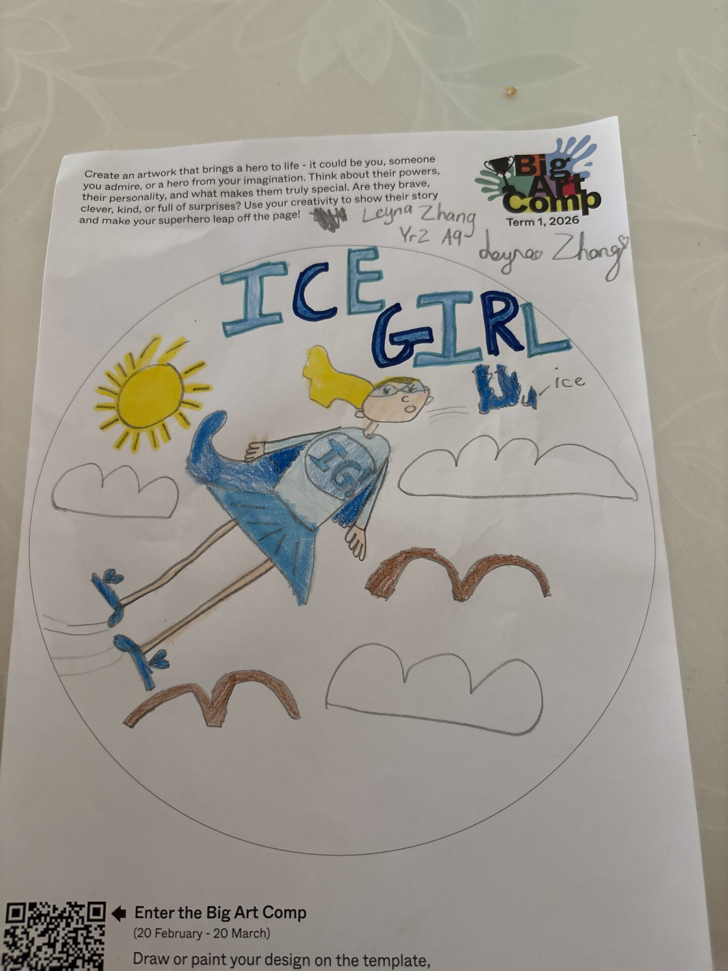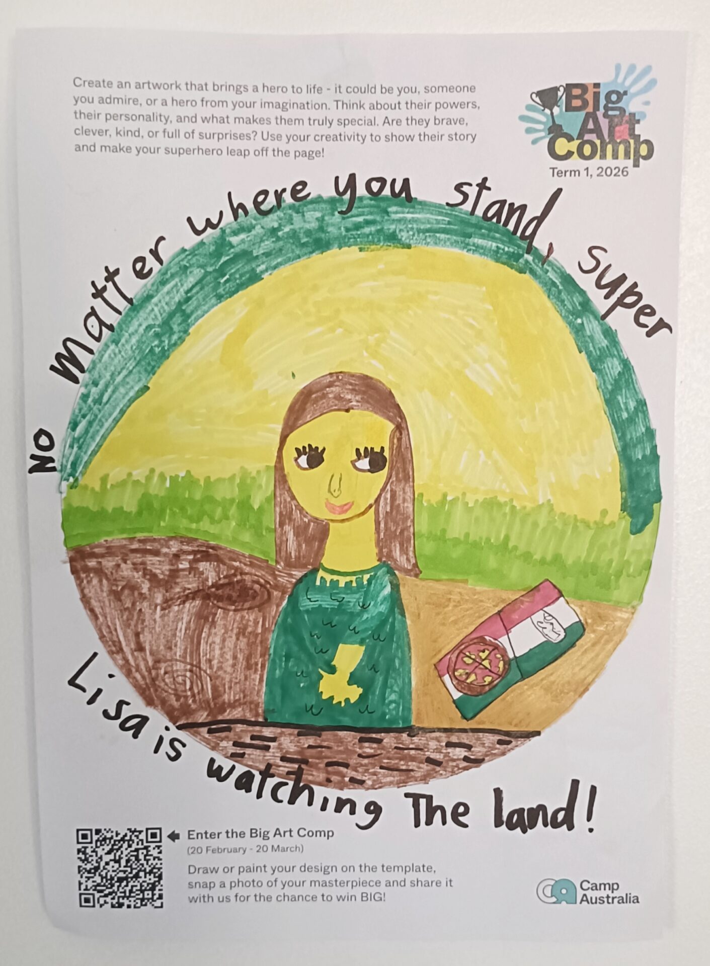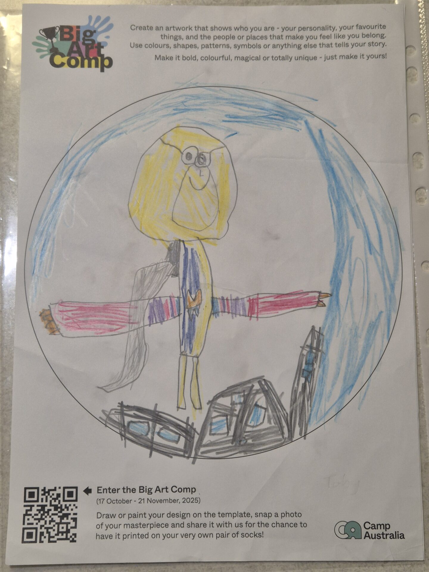 A huge thank you to all the incredible young artists who took part in our Term 1 Big Art Comp. Your superhero creations were full of imagination, energy and bold ideas – and we loved seeing what being a hero means to you.